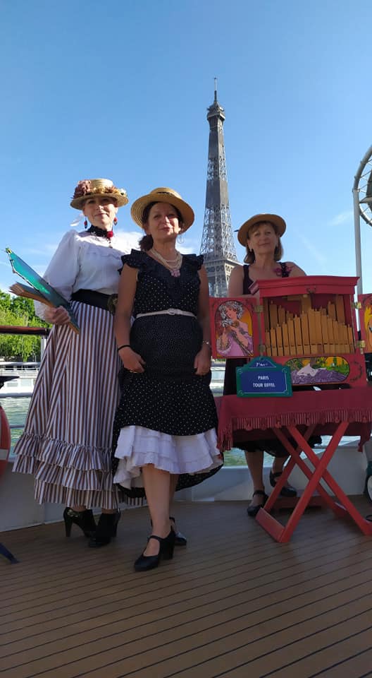 Myrtelle croque tandis que ses collègues Domi ou Joël chantent accompagnés de leur magnifique orgue de barbarie